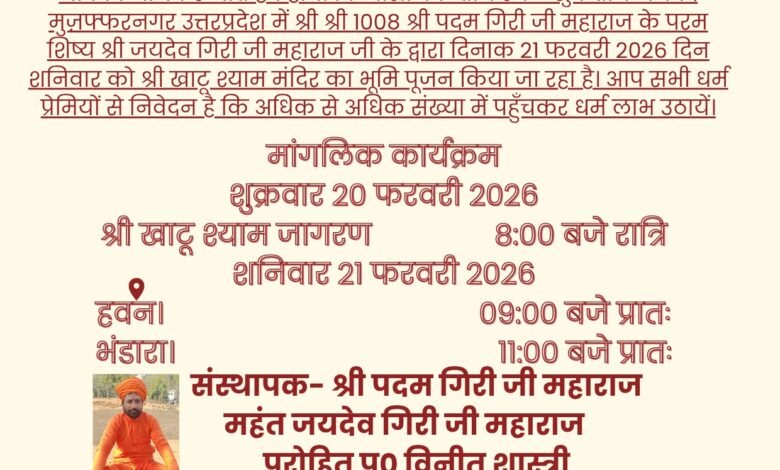 जनपद मुज़फ्फरनगर के ऐतिहासिक पौराणिक तीर्थ स्थल शुकतीर्थ में खाटू नरेश श्याम बाबा का भव्य धाम का भूमि पूजन 21 फरवरी को होगा। श्री श्री 1008 श्री रघुबीर जी नागा बाबा टिल्ला दशनाम अखाड़ा सन्यास आश्रम शुकतीर्थ के महंत जयदेव गिरी जी महाराज ने बताया कि 21 फरवरी को खाटू श्याम बाबा के भव्य मंदिर का शिलान्यास बड़ी धूम धाम से किया जाएगा । कार्यक्रम में 20 फरवरी को साय 8 बजे से श्याम बाबा का भव्य जागरण होगा 21 फरवरी को प्रातः 9 बजे हवन व 11 बजे भंडारा होगा। मंदिर के संस्थापक श्री पदमगिरी जी महाराज की प्रेरणा से सभी के सहयोग से भव्य मंदिर का निर्माण होगा तीर्थ स्थल शुकतीर्थ में आने वाले श्रद्धालुओं को खाटू नरेश के दर्शन होंगे आश्रम के संचालक मंडल पूरे ऊर्जा के साथ भव्य मंदिर के निर्माण हेतु संकल्प बध है।
