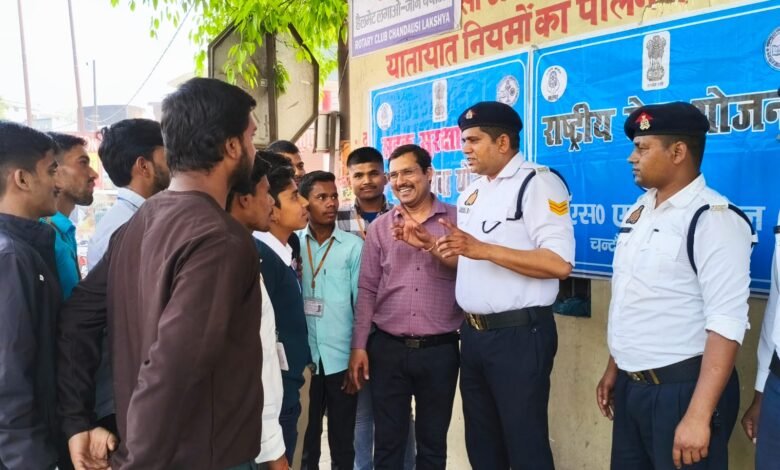 जनपद संभल के कुशल निर्देशन में एवं क्षेत्राधिकारी यातायात और प्रभारी यातायात दुष्यंत बालियान के निर्देशन में बदायूं चुंगी चंदौसी यातायात पुलिस बूथ पर हेड कांस्टेबल सचिन कुमार और हेड कांस्टेबल सतीश ओर कांस्टेबल गुलाब द्वारा राष्ट्रीय सेवा योजना (NSS)के छात्रों को यातायात नियमों के बारे में जागरूक किया गया!ओर छात्रों से यातायात संबंधी स्लोगन भी बनवाए गये!जिसमें मुख्य रूप से दो पहिया वाहन पर हमेशा हेलमेट का प्रयोग करेंगे! दो पहिया वाहन पर तीन सवारी नहीं बैठेंगे! तेज गति से वाहन नहीं चलाएंगे! वाहन चलाते समय नशे का सेवन नहीं करेंगे!नींद में वाहन नहीं चलाएंगे!सड़क पर हमेशा बाई तरफ चलेंगे! मोड आने पर ओवरटेक नहीं करेंगे !और पैदल यात्री भी सड़क पर चलते समय यातायात नियमों का पालन करेंगे और मुख्य रूप से छात्रों को उत्तर प्रदेश सरकार द्वारा चलाई जा रही राहवीर योजना के बारे में विस्तार से समझाया गया! जिसमें किसी व्यक्ति की दुर्घटना में घायल होने पर गोल्डन ऑवर के अंदर अस्पताल में पहुंचाने पर अगर उस व्यक्ति की जान बच जाती हैं तो नेक व्यक्ति को 25000 रुपए की पुरस्कार राशि दी जाएगी और प्रशस्ति पत्र भी दिया जाएगा !इसलिए दुर्घटना में घायल किसी भी व्यक्ति की मदद करने से घबराना नहीं चाहिए !ओर छात्रों को बताया कि आप देश का भविष्य है! अगर आप जागरूक होंगे तो दूसरों को यातायात नियमों के प्रति जागरूक करने में मदद मिलेगी जिससे दुर्घटनाओं में कमी आएगी!