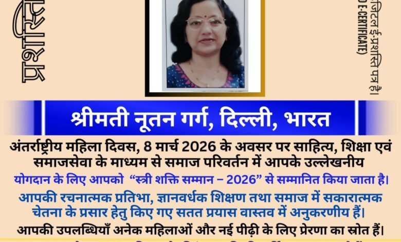 नूतन गर्ग (दिल्ली)* को नेपाल से *स्त्री शक्ति सम्मान* से अलंकृत किया