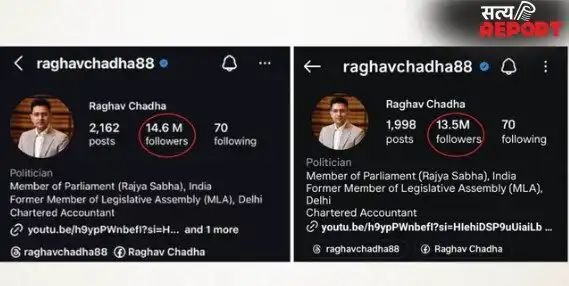 बताया जा रहा है कि शुक्रवार को राघव चड्ढा के इंस्टाग्राम पर 1.46 करोड़ फॉलोअर्स थे, जो शनिवार दोपहर 2 बजे तक घटकर 1.35 करोड़ रह गए। यानी एक दिन से भी कम समय में उनके फॉलोअर बेस में बड़ी कमी आई।